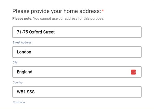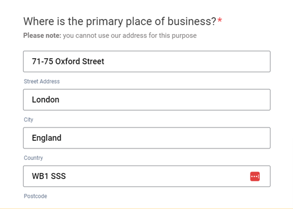 Step 16: You cannot enter our address as your Business Contact Address. You must enter the address you are trading from at e.g. your home address.