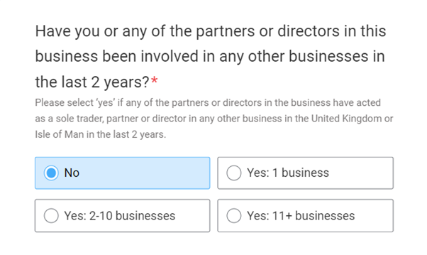 Step 20: Please select ‘yes’ if any of the partners or directors in the business have acted as a sole trader, partner or director in any other business in the United Kingdom or Isle of Man in the last 2 years. You will need to enter the relevant company name, number and status of the company.